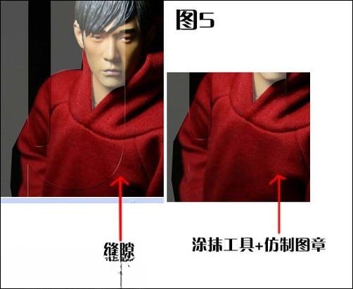 因为处理过图层混合模式的图层不能合并,所以做到这里,先将图片保存为JPG格式,然后用PS打开,只后用涂抹工具将两个图层之间的接缝部分涂抹掉,要配合仿制图章来制作。如图5。