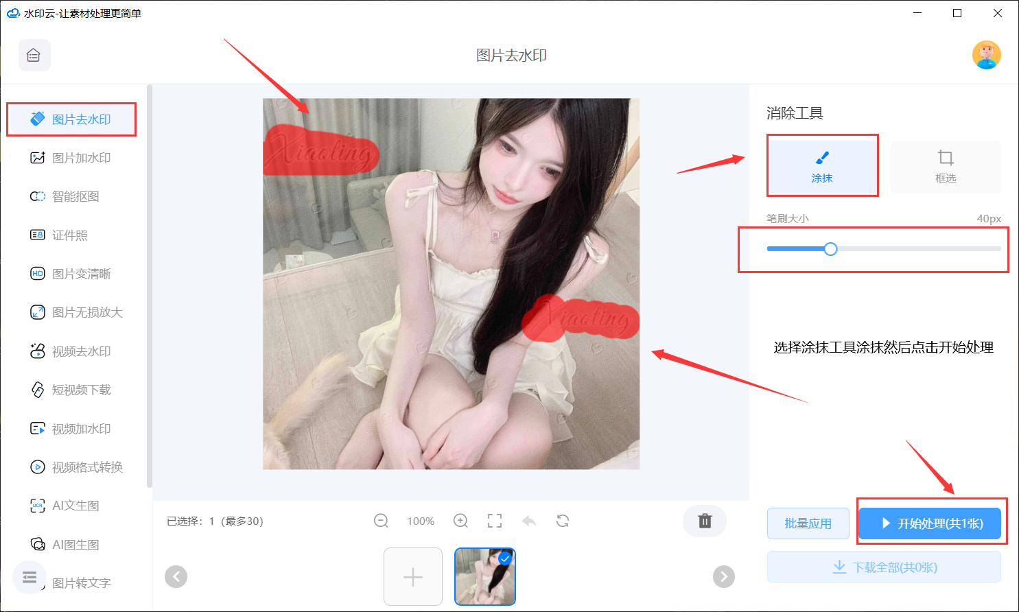 水印云小红书图片去水印。这款工具可以帮助你快速、准确地去除图片的水印。只需上传图片,选择水印区域,工具就会自动识别并去除水印。这种方法比较方便快捷,适合处理大量图片,只需要涂抹或者框选AI自动识别,不需要你过多的操作非常适合新手小白。