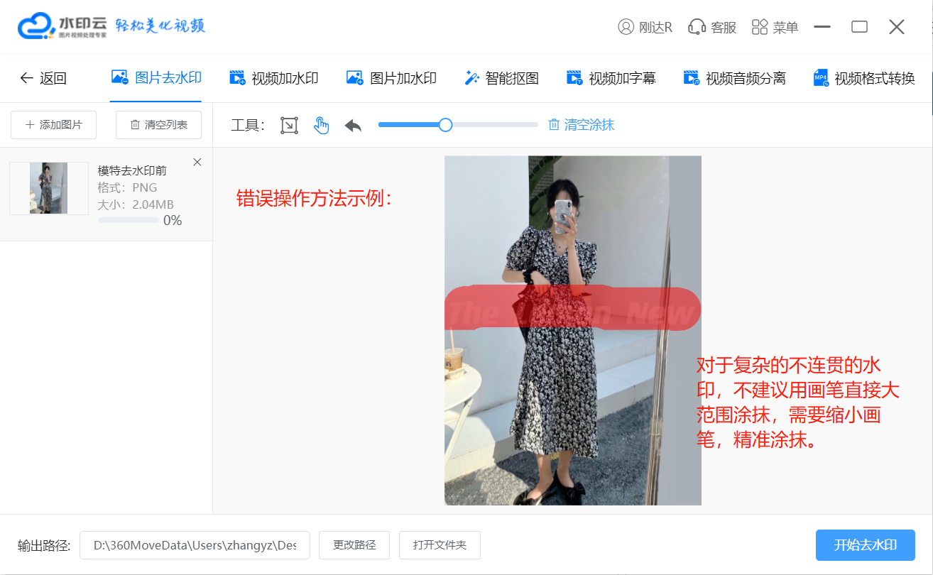 涂抹去水印:适用于复杂背景的水印、全屏水印等。